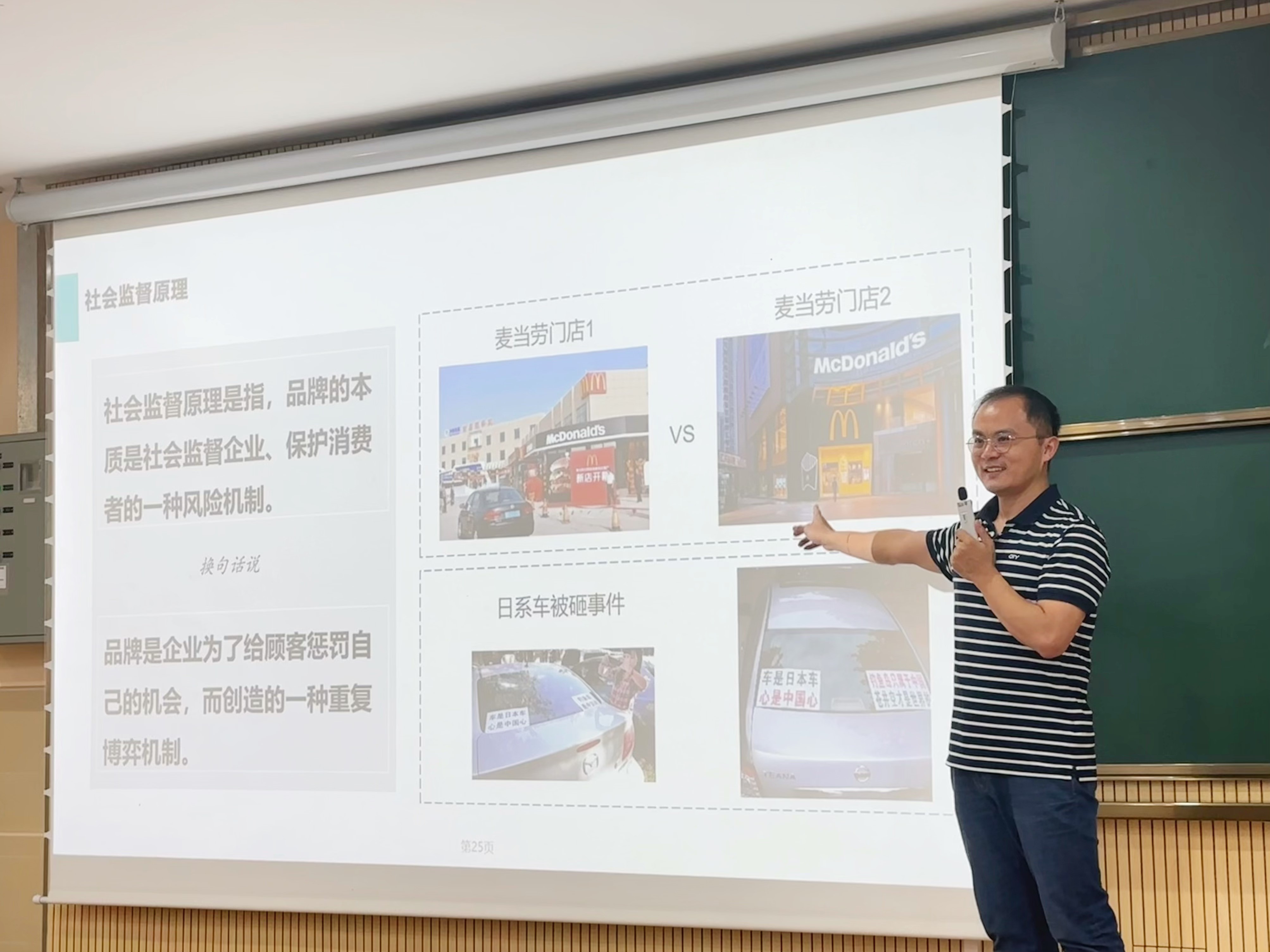 李博士围绕品牌思维、数字营销变革和个人品牌构建三个主题展开分享,系统阐释了品牌战略的基本原理与竞争逻辑,指出品牌的本质在于通过建立信任机制降低社会交易成本。他结合多个中外典型品牌案例,深入分析了“离消费者更近”的数字品牌运营模式,并以“产品四问”模型为引导,鼓励同学们将品牌理念应用于个人职业发展,提升自我表达的清晰度与说服力。