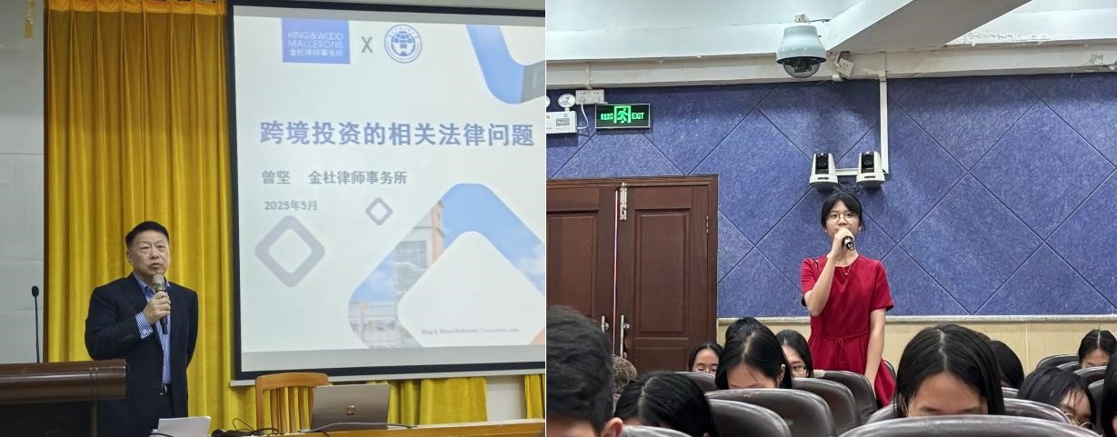 为深化员工专业知识理解、提升职业素养与实践能力,5月22日下午,伟德体育于白云山校区水上报告厅成功举办“行业专家进课堂系列活动”。活动特邀金杜律师事务所合伙人曾坚律师担任主讲嘉宾,为师生带来主题为“跨境投资相关法律问题”的精彩讲座。公司经理胡春雨、党委书记苏冬燕、副经理汪谓超、党委副书记杜焕君,以及各系主任、相关专任教师出席活动,23级法英专业、24级法双专业员工参与其中,共同聆听行业前沿经验。