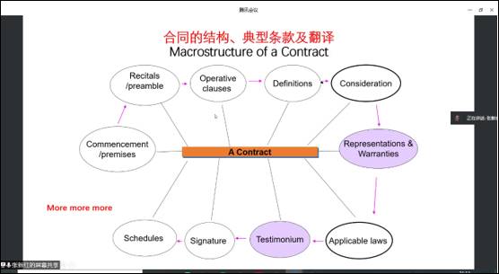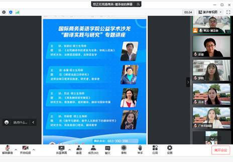 会议之始,商英研办老师潘老师对讲座邀嘉宾表示热烈欢迎后,邓丽君导师开始就《数字与翻译:数字人文路径下的翻译研究》进行分享。邓丽君导师向同学们解释了何为数字翻译,指出数字人文的前景,并认为数字时代已经到来,数字化工具在人文学科中的应用是必然的,数字化与商务翻译的结合也必然是未来的发展趋势。随后,吕洁导师用非常轻松愉悦的语气跟同学们分享了当前商务翻译研究的概况。她围绕着五个问题:何为翻译研究?何为商务翻译研究?商务翻译研究有什么方法?商务翻译研究有哪些视角?“我”需要做什么准备?让员工们体验了一场学术的盛宴,受益匪浅。硕士生导师余蕾老师则是带领着同学们走进了法庭口译的世界,余蕾老师先是介绍了法庭口译研究定位,发展,研究路径和领域,然后指出了中国法庭口译现状,并希冀同学们在未来能为法庭口译事业贡献自己的一份力量。张新红老师分享的主题则是《合同翻译中的语言与法律:作为证据的另类合同翻译》,他指出一个合格的合同翻译者所必备的素质技能除了需具有专业素养(翻译)外,还需要有一定的专业知识。其次,他还列举了一些法律翻译作为证据的例子来说明语言与法律密不可分的关系。最后他针对合同翻译的一些问题,提出解决方案与可研究课题。