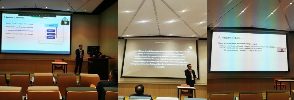 “数字媒体中的商务话语” 分论坛上午场由公司副经理、博士生导师刘平教授主持。公司乐思伟副教授探讨了嘲笑这种多模态语言行为对社交媒体中欺诈行为的影响,并就多模态研究设计的互动现象和企业与网友互动策略的动态调整与观众进行了交流。公司教师、在读博士生彭娜通过对中国女性企业家张兰的抖音视频进行多模态内容分析,探究数字经济时代下市场营销中的印象管理及其多模态资源的使用策略,并就未来研究的方向(如观众反应等)与参会者进行了讨论。博士研究生陈嘉亮从交互文化语用学视角出发,分析了国际商务会议中作为礼貌策略的元语用表达及其人际功能,并就元语用表达的界定和社会-认知分析视角向与会专家老师们请教。硕士研究生李沅桦围绕专业书面电子商务销售语篇中的语境化线索进行分享,同时与在场老师和同学讨论了研究中涉及的语境限制、交际目的与意义创建。硕士研究生王良莉使用跨语言对比的方法分析了餐厅评论中关系行为的使用,并对研究的创新性及贡献做了深入阐释。硕士研究生杨东衡分享了拟人化社交媒体营销中的身份构建研究,探究了和谐关系管理与营销推广的关系,并就和谐关系管理模型的应用及发展与在场观众进行交流。该会场的最后一位发言人是广外伟德体育博士研究生、广东行政公司副经理杨璘璘副教授。她的汇报主要考察创业者-投资者融资互动中多方联盟关系的协商和建构问题,重点探究了多方联盟关系的类别、话语资源、语用策略以及发挥作用的语用理据。现场的专家老师和同学们对多方联盟关系的界定以及其中凸显的语言手段和语用策略等问题展开了热烈讨论。分论坛结束前,刘平教授感谢大家积极参与论坛分享,并鼓励大家继续开展数字媒体中的商务话语研究,希望在场老师和同学们能够享受未来的学术之旅,为学术界和商业领域带来更多的创新和发展。