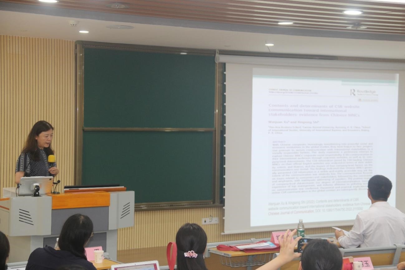 在下午2点的第五场主持发言中,史兴松教授带来了题为“中国跨国企业网络社会责任话语内容及决定因素研究”的精彩讲座。史教授以中国跨国企业网络社会责任话语为研究语料,分析企业社会责任信息的可见度、程度和主题,并通过建模检验企业层面因素对企业社会责任网络传播的影响。史教授指出,中国企业普遍以可见和容易获取的方式展示企业社会责任信息,但沟通程度有待提升;沟通重点多关注消费者、社区和员工等利益相关者,与供应商的沟通不够充分。国际化程度、高层管理者的海外经验、与污染源行业关联等企业层面决定因素对社会责任话语沟通产生积极影响。史教授的创新性研究对中国跨国企业社会责任话语网络传播具有重大理论价值和实践意义。