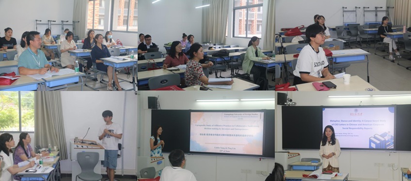 在七位专家主旨发言结束后,参加平行分论坛的研究生和老师们在一教南楼七个分会场,分别进行研究展示并就研究向专家请教。第一组平行论坛的主题是“跨文化商务交际研究”,由汪谓超副教授主持,杨文慧教授担任点评专家。本组的发言视角多样,聚焦四个方面:第一,以认知为切入点,对中美商务语篇进行认知识解、意象图示分析和批评隐喻分析;第二,从语用视角出发,对中美基因检测广告语篇的对比分析和BELF 电子邮件中奉承策略进行实证研究;第三,关注跨文化商务英语教学,基于 ChatGPT探讨跨文化商务教材中国文化的呈现,以及对跨文化交际课程设计进行案例分析;第四,从粤港澳大湾区语言服务人才需求的角度对企业招聘话语进行定量分析。在本组的点评环节中,两位专家在肯定同学们研究价值的同时,提出了宝贵的建议,尤其鼓励同学们以语言为工具,进行跨文化、跨学科研究,打破越来越细致的学术分工,从多视角切入解决理论和实践问题。