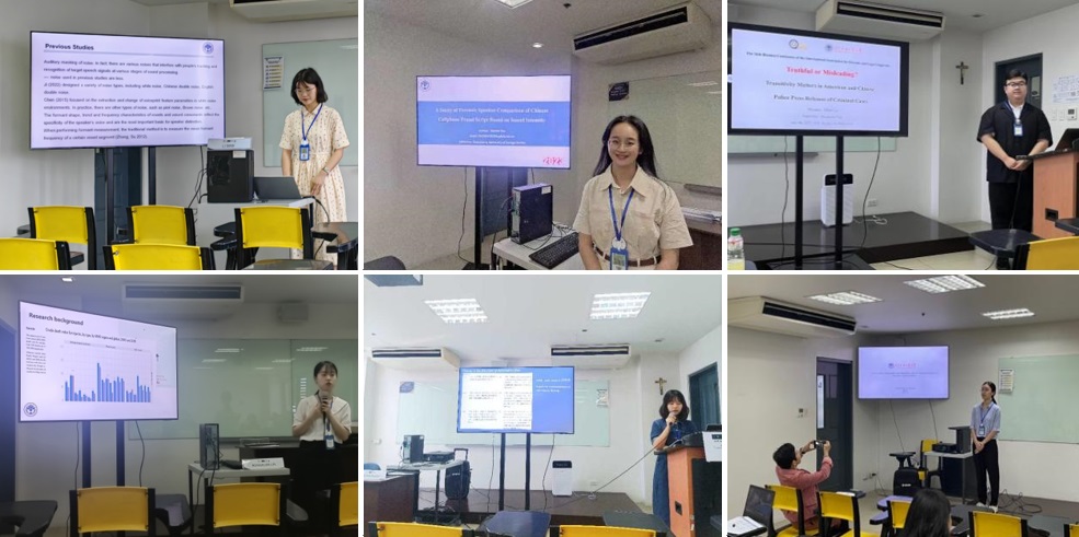 研一的六位同学主要围绕司法语音比对、警情通报、作者鉴别、庭审话语和合同文本等方面进行小组发言。