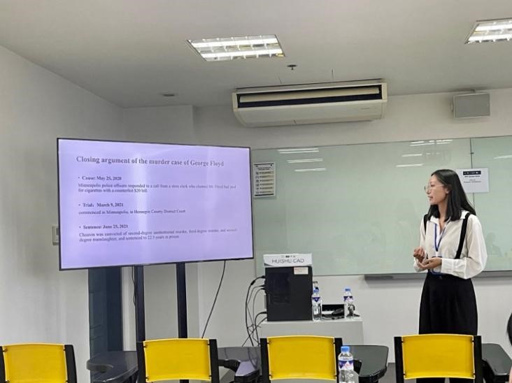 研二的六位同学主要围绕合同翻译、律师辩词的立场副词、微博警情通报、电视调解、辩护律师的辩护话语等进行了汇报。