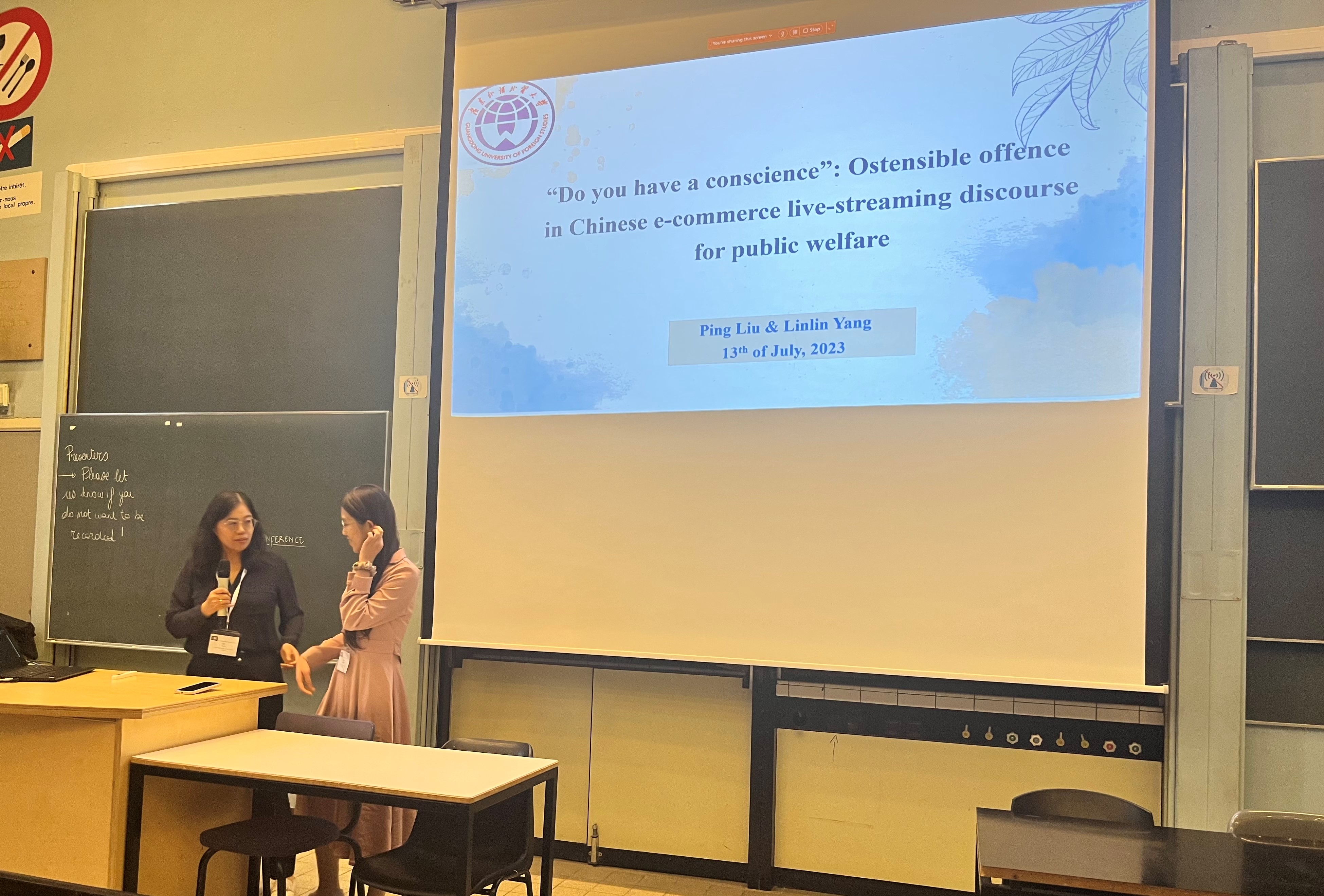 刘平教授、黄旭博士和杨璘璘同学参加了公司冉永平教授组织的“Impoliteness in Chinese social media”(中国社交媒体中的不礼貌问题)专题论坛。刘平教授和杨璘璘同学在人际语用学视角下,探究公益电商直播互动中假意冒犯(ostensible offence)的冒犯对象、关涉的面子类型、所实现的交际功能以及遵循的网络实践共同体规约。黄旭博士在元语用视角下讨论了中文社交网络上“不礼貌”与“冒犯”的本质内涵及其区别性特征,发现了两者在中国文化中的细微差别。刘平教授和陈嘉亮博士参加了Miriam Locher教授和Thomas Messerli博士组织的“It’s not what you are like, it’s what you like: Appraisal, stance and evaluation in online fandom”(重要的不是你像什么,而是你喜欢什么:网络粉丝圈中的评价、立场和评估)的专题论坛。他们分析了中国电商直播节目中的站位表达(stance expressions)与网络粉丝圈的动态关系。