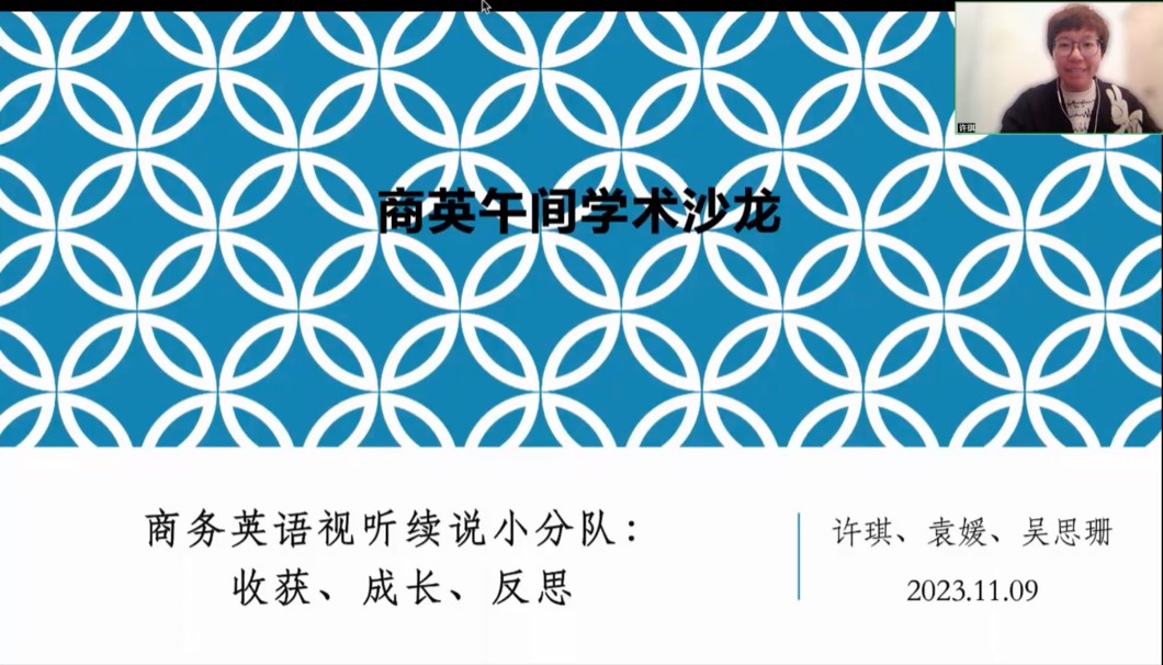 为深入学习贯彻习近平新时代中国特色社会主义思想,积极推进伟德体育科研发展和研究交流,公司于2023年11月9日在线上开展了本学期第二次午间学术沙龙。商务英语教学研究团队的许琪、袁媛、吴思珊三位老师进行了题为“商务英语视听续说小分队:收获、成长、反思”的分享。公司副经理刘平、汪谓超以及20多位来自不同公司的老师和同学参与了本次活动。