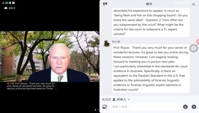 在最后的讨论环节,与会听众就讲座内容发表见解并提问,如专家证人的遴选标准、出庭作证的挑战等。Royce教授就相关问题逐一解答,讲座至此圆满结束。本次讲座让老师和同学们深入地了解了法律语言学专家证人的多方面责任和挑战。大家都表示在此次讲座中收获颇多,期待明年的系列讲座。