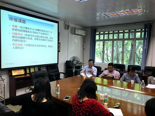 王初明教授首先给大家解释了如何在高层次项目申报前“心眼活”,申报过程中“我为主”,以及申报成功后“功夫死”。然后,王教授以申报书中的“国内外研究现状评述”为例,向大家介绍了国家社科项目申报的注意事项及填报技巧,尤其强调要以问题为导向,突出创意,并在评述后明确提出自己的研究问题。在此过程中,王教授还向在场的老师推荐了由文秋芳教授等发表在《外语界》第一期中的文章——“国家社会科学基金项目通讯评审策略与态度的访谈研究”。