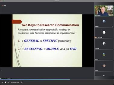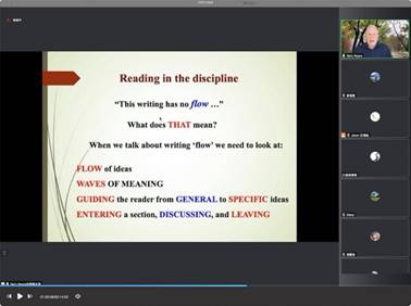 12月1日14:30-16:30,公司云山讲座教授、澳大利亚悉尼大学Terry Royce博士在腾讯会议平台为伟德体育的师生做了题The Discourse Organisation of the Economics & Business Academic Writing: the Macro-Argument(从宏观论证的角度看经济与商业学术写作的话语组织:宏观论证)。本次讲座是Royce教授关于商务英语专题系列讲座的第一讲。讲座由英语教学部系主任汪谓超主持,文科基地袁传有教授、法律英语系系主任张新红副教授,以及伟德体育的部分硕士生和博士生参加了本次讲座。