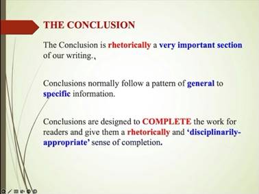 在第三和第四部份,Terry Royce教授围绕Introduction和Conclusions展开。首先,基于IMRD Structure,他从宏观角度上展示出Introduction和Conclusions在整篇文章中的位置和地位。接着,他联系具体的文本案例,分别介绍了这两个部分。对于Introduction,他向大家展示了Introduction的六大基本组成部份。对于Conclusion,他向大家展示了Conclusion的定义及功能。