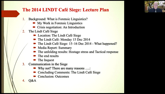 Royce教授在此次讲座中分享了一个颇受各界关注的案例:2014年12月15日发生于澳大利亚悉尼市中心林德咖啡馆的人质劫持事件。以此案例为中心,Royce教授详细介绍了法律语言学研究的领域、警务危机谈判理论与沟通模型,分享了该案件经过和案件结果引发的思考。本次讲座内容分为四个部分:法律语言学背景铺垫,案例介绍与分析,案例结果讨论与思考,问答环节。