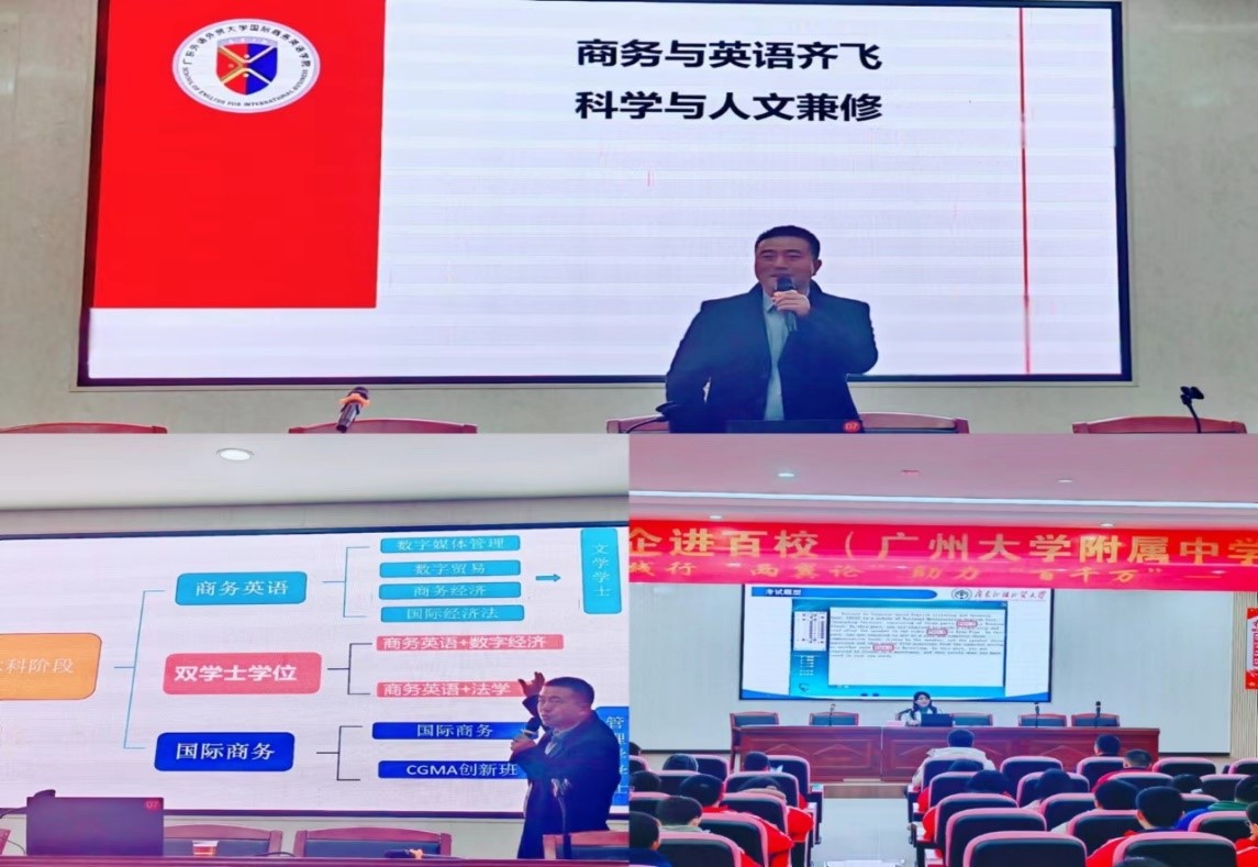 上午,宣讲队伍抵达首站英德广大附中,该校副董事长胡玉新热情接待。双方首先围绕提升员工数智素养、巩固优质生源基地建设、继续深化双方交流合作等事宜进行了探讨。随后,严小庆主任对300多名高三毕业生进行英语备考指导,并对该校参会的英语教师进行教学提升指导。伟德体育副经理汪谓超从团队力量、学科发展、人才培养创新等方面介绍了公司情况,重点介绍了2024年公司新开办的双学士学位项目(商务英语+数字经济、商务英语+法学)及升级后的商务英语专业方向(数字媒体管理、数字贸易、商务经济、国际经济法)。