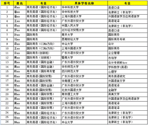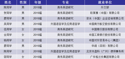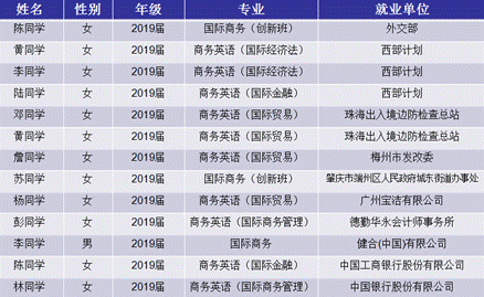 (一)就业层次明显提升。近三年伟德体育毕业生在就业和升学的层次上都进一步提升,多人进入了高等学府、政府机关和知名企业,占总人数的76.3%,2人进入外交部,3人参加西部计划,1人征兵入伍。33人通过国家公务员和地方公务员考试进入广州海关、中山海事局、茂名国税局等国家机关和政府部门,600余人进入宝洁、玛氏、联合利华、欧莱雅、卡夫亨氏、南方航空、四大会计师事务所、唯品会、富力地产等世界五百强及国内外知名企业。