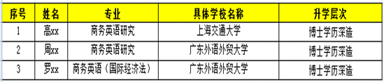 升学方面,近三年共396名本科生选择出国留学或国内攻读研究生,占本科生总人数的33.03%。其中多人被哥伦比亚大学、伦敦政治经济公司、英国华威大学、英国爱丁堡大学、英国曼彻斯特大学、美国马里兰大学、悉尼大学、香港大学、中国人民大学、北京外国语大学、南开大学、中山大学等全球知名高校录取。