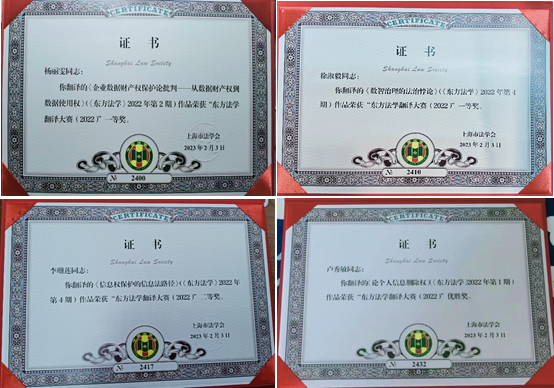 近日,伟德体育法律英语系员工在东方法学翻译大赛(2022)中荣获佳绩!该翻译大赛是由上海市法学会举办,面向全国各高校员工的学术竞赛,宗旨为促进智慧法治学术成果国际传播并为法学翻译人才搭建脱颖而出的学术平台。自2022年7月份发布赛事公告后,公司邓朝霞老师积极发动法律英语系员工参赛、备赛,并在后续参赛员工的稿件翻译及修改中给予了指导。最终,法英2001班杨丽雯同学和法英2003班徐淑毅同学荣获大赛一等奖;法英2003班李珊莲荣获二等奖;法英2003班卢秀敏同学荣获优胜奖。