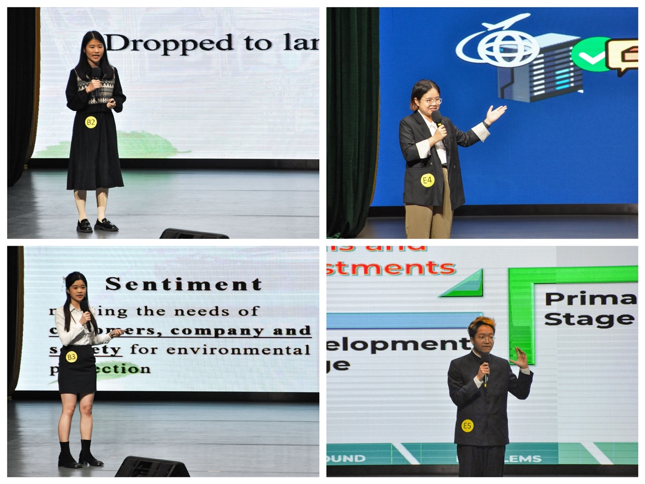 比赛过程中,参赛选手们在13分钟内从多方面全英解说各自队伍的调研成果,充分展示了公司学子扎实的英语素养和国际化的视野。Eco-Glow队对莱倩化妆品有限公司展开调研,对其品牌知名度不高及绿色环保理念不足的问题给出了用小红书等新媒体进行推广和普及快闪店的创新性意见。Grinning队进行调研的公司是家居品牌oasis object,他们结合产品特点提出了家具回收计划,点明了绿色经济的主题。Rookie King队则在调研菜鸟公司后,针对其在绿色环保方面完成度较差的问题提出了例如回收包装盒、提供可生物降解包装袋等一系列解决措施。Ecotricity队关注当今新能源汽车浪潮,立足充电停车场企业eParking进行调研,提出增加充电桩和降低收费等建议。Hawks队立足航空产业发展和绿色经济的相关联性,对进行飞机拆解和回收的天弘航空科技公司进行考察,对设计失事飞机组件评估系统进行调查研究,充分展现了我国大国航天背景下学子充分关注国家大事的爱国情怀和为国家航空航天事业发展出一份力的决心。