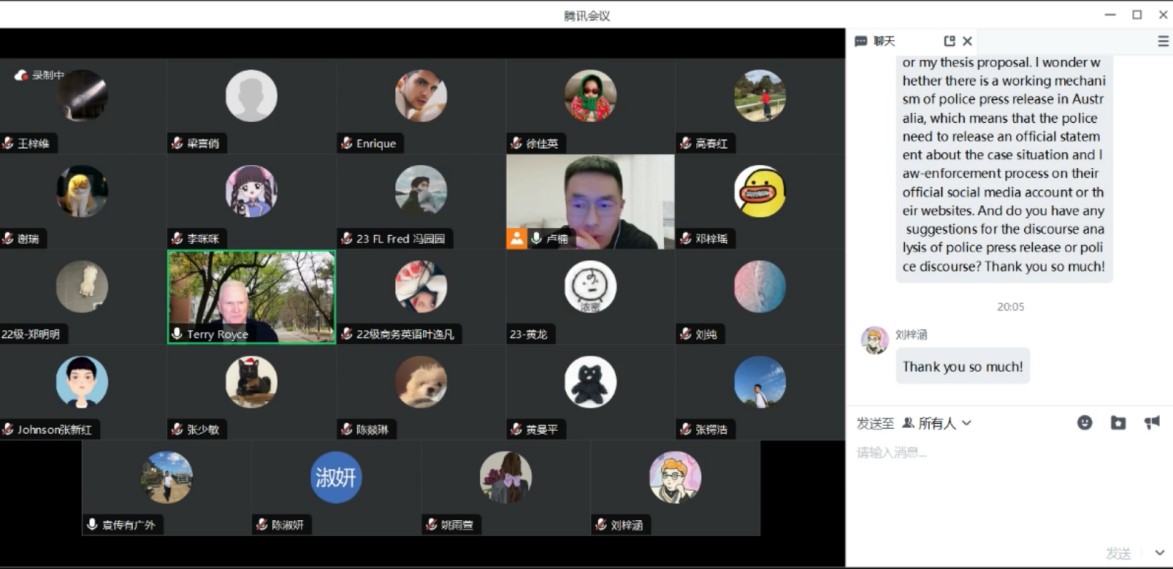 2023年10月26日,伟德体育云山讲座教授Terry Royce教授的法律语言学系列讲座如期于线上举行。本次讲座由伟德体育研究生办公室主任卢楠博士主持,文科基地袁传有教授、法律英语系张少敏老师以及伟德体育的其他本科生和硕博士生参加了本次讲座。
