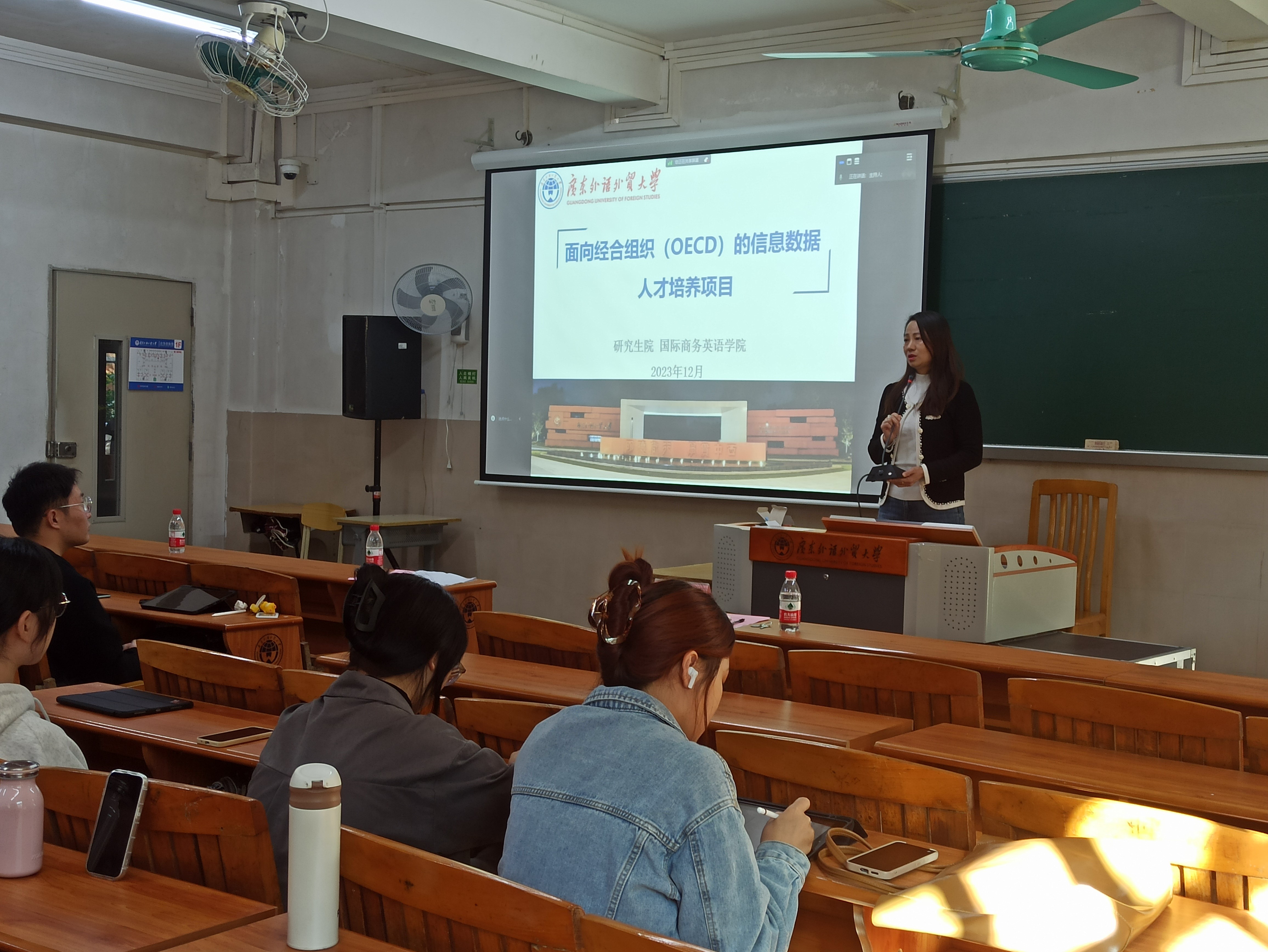 伟德体育副经理杨文慧教授从项目背景与培养目标、培养模式、选拔对象和资助办法、选拔方式、选拔人员回国后安排等方面,详细介绍了OECD项目概况。她结合首届学员国际组织实习经历,勉励研究生同学勇于挑战自我,把握机会、积极报考。她强调,项目采用“课程学习-实习实践-就职工作”全链条国际组织人才培养模式,旨在培养从事竞争信息收集以及数据处理的高素质国际化人才。