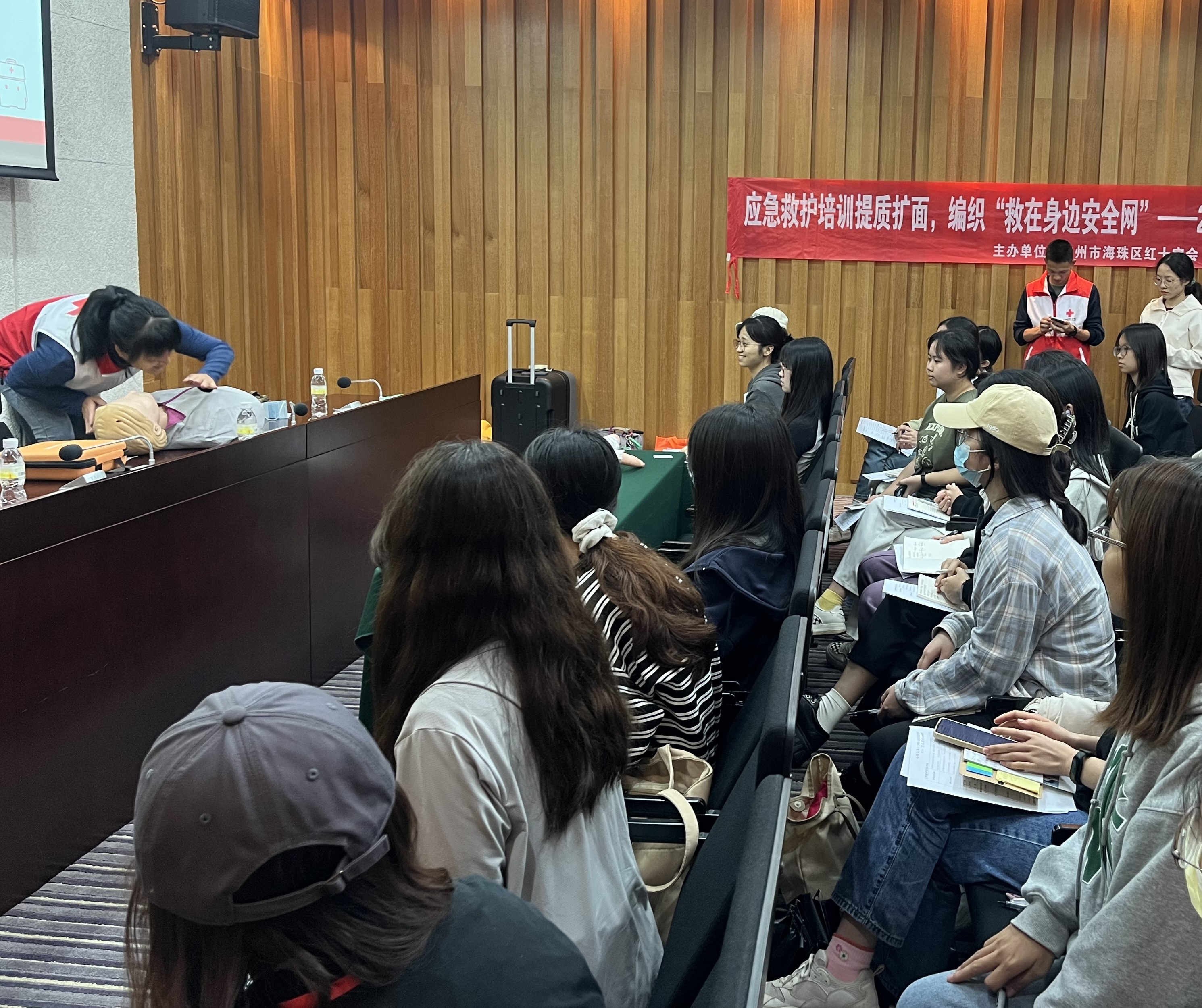 为做好第135届广交会现场医疗卫生应急保障工作,响应广州市健委关于组建广交会展馆内医疗志愿者队伍的号召,公司积极动员2021级全体实习生党员,发挥党员先锋模范带头作用,组建了一支政治强、语言精、素质高、纪律严的双语医疗保障志愿服务队,为广交会各展馆提供医疗援助和咨询服务。为提升这支队伍的专业技能和应急处理能力,2024年4月8日和9日下午,由广州市健委牵头,广州市海珠区红十字会主办,东泽培训中心承办的第135届广交会医疗保障志愿者培训大会分别在广交会展馆和伟德官方网站召开。出席本次培训大会的有:广州市红十字会刘鹏程老师,广州市红十字会谢老师,21级辅导员钟坤老师,伟德体育第135届广交会医疗志愿者。