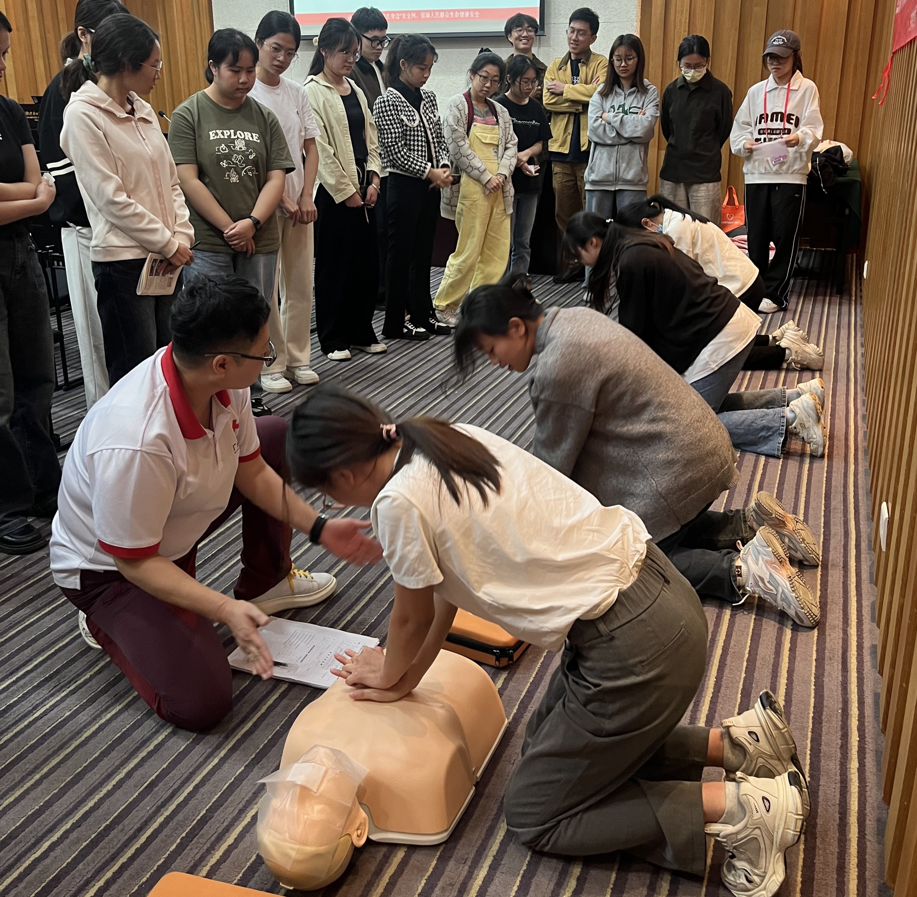 在教学演练和二次理论培训后,医疗志愿者们按照序号分四个小组跟随红十字会的四位老师进行心肺复苏以及AED使用实操流程练习。在实操过程中各位老师为志愿者耐心演示、悉心指导,确保每位志愿者熟悉所有流程,完成全部细节,为考核做好充分准备。