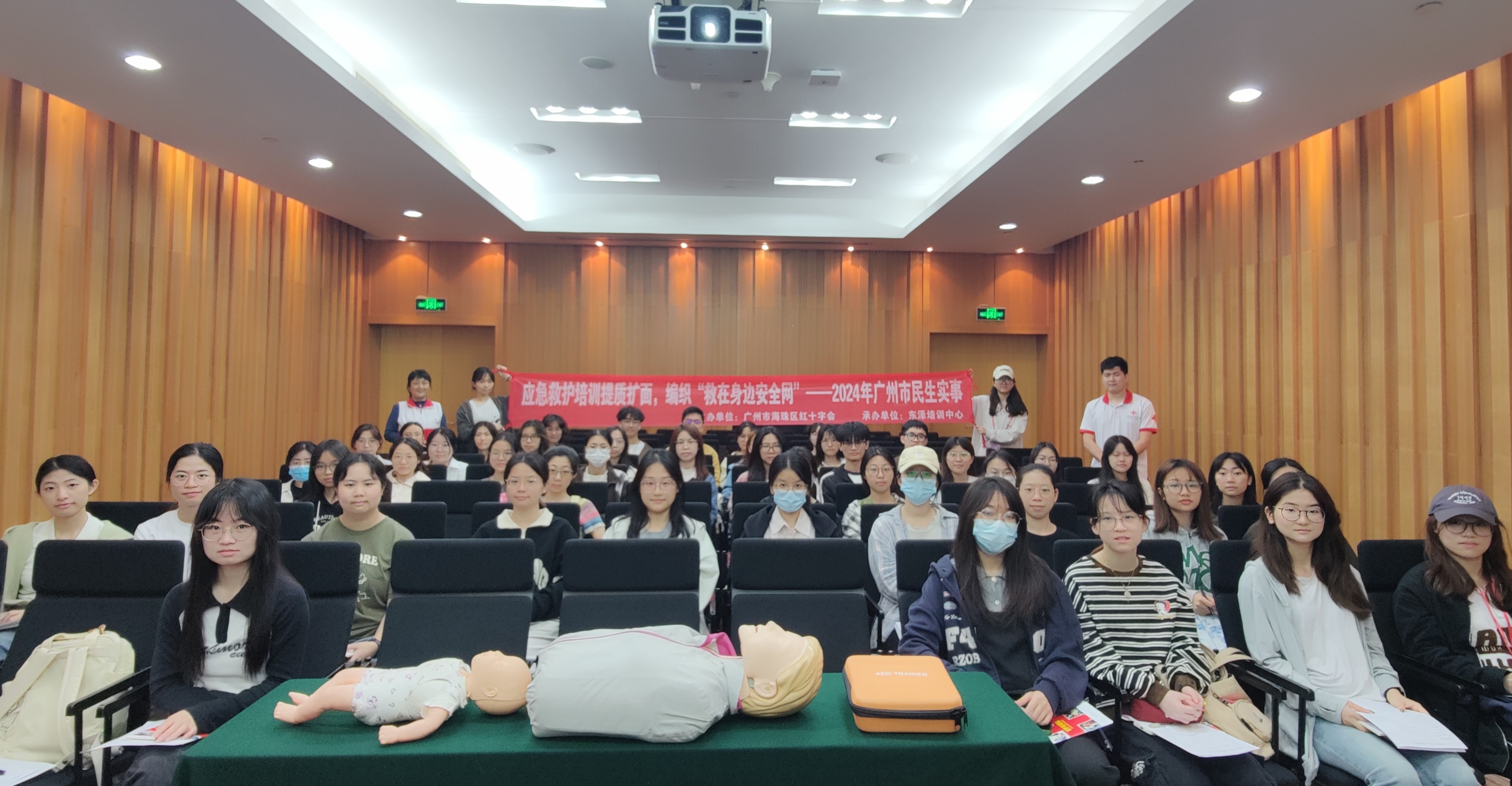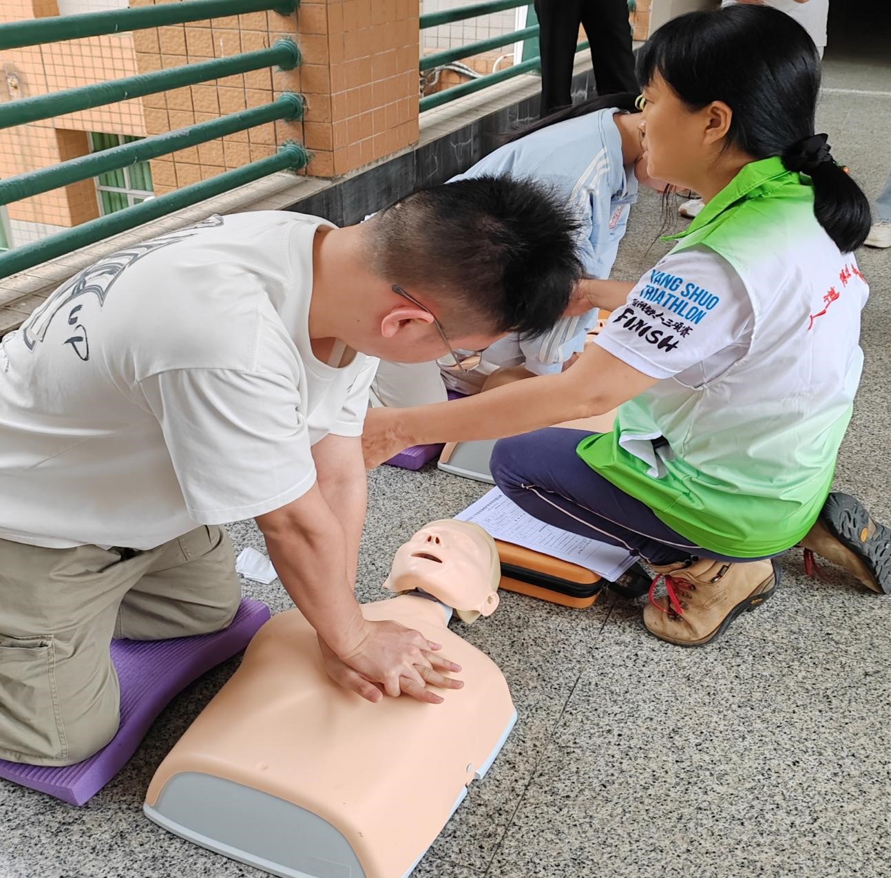 而后,广州市红十字会谢老师进行现场成人心肺复苏操作以及自动体外除颤器(AED)使用流程的教学演示。演示生动形象,细致全面,医疗志愿者们悉心学习。演示结束后,刘老师对AED使用以及气道异物梗塞施救方法开展理论培训,为了帮助医疗志愿者们加深对心肺复苏以及AED使用实操流程和细节的理解,培训人员还对心肺复苏以及AED使用流程进行了二次教学演示,并邀请志愿者现场体验。