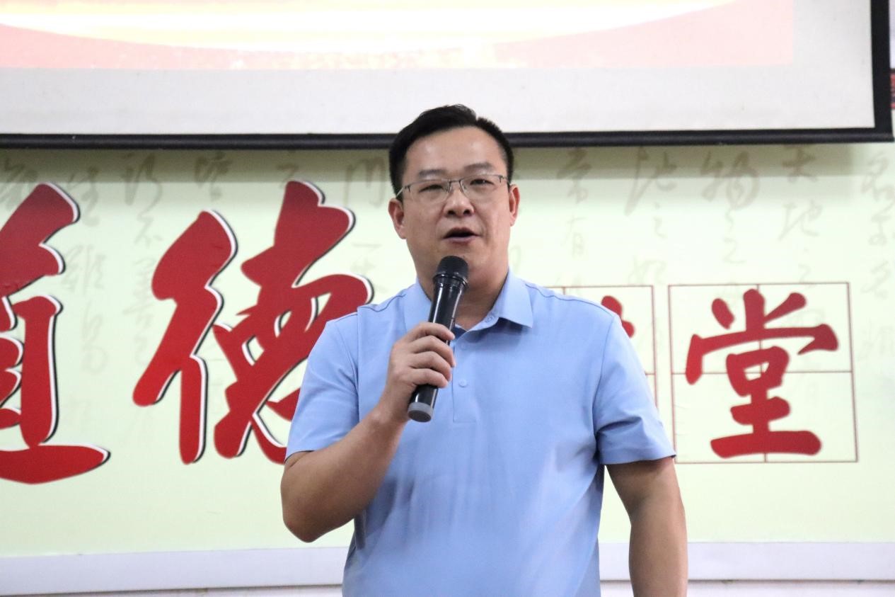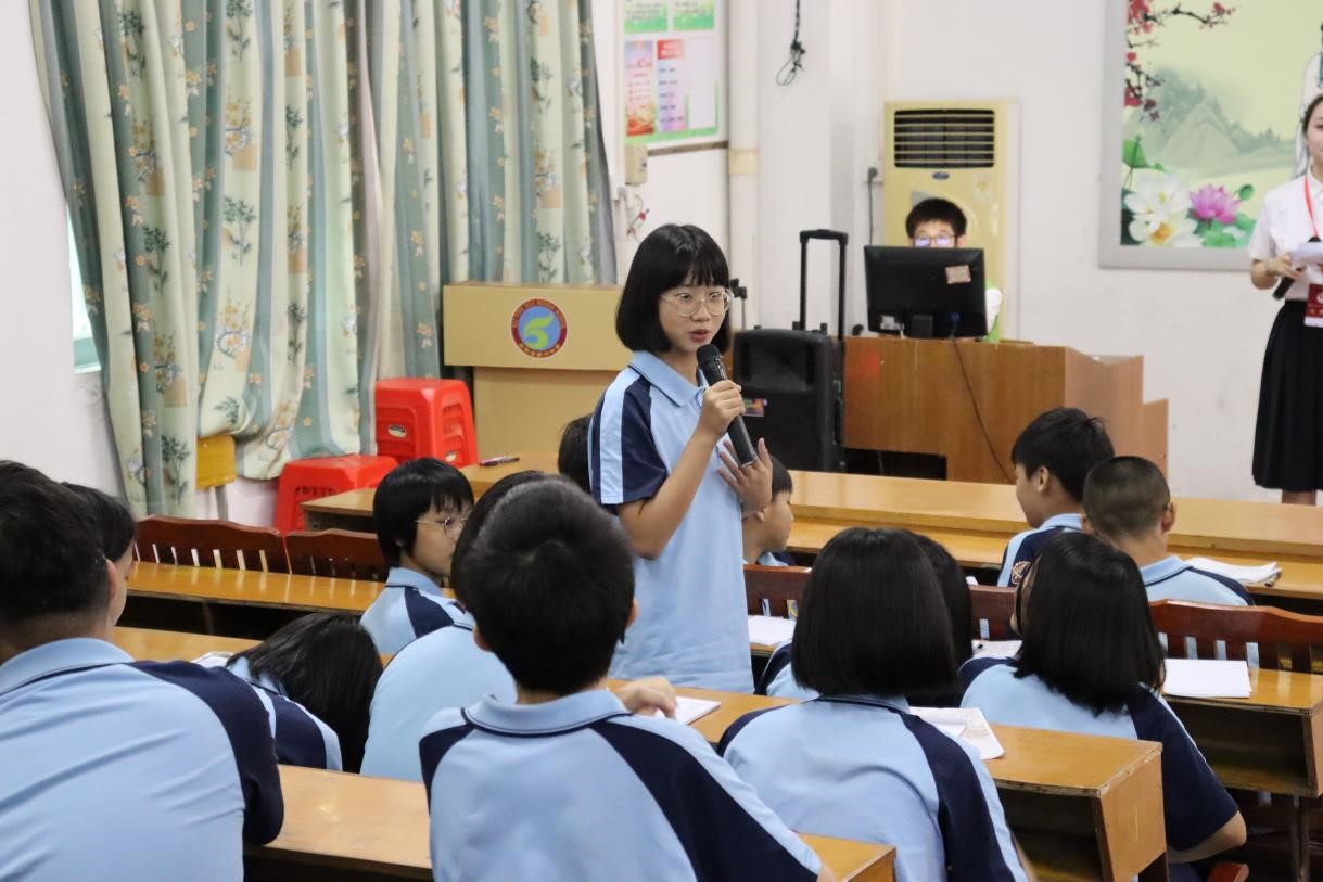 最后,开平董事长梁新赞上台发表讲话。他首先引用了活动现场展板上的醒目标语——“家国情怀,跨山越海”,向不辞辛苦前来开平六中开展实践活动的侨乡邑梦实践团表示感谢,并对本次活动的成功举办和创新形式表示肯定和赞赏。随后,他深情地讲述了开平、赤坎古镇等地爱国华侨的英勇事迹及其为了家国利益,不辞辛劳,远渡重洋,展现出了华侨浓厚的爱国情怀。其中,他还特别提到了杰出的侨民司徒美堂对国家做出的巨大贡献,他的故事深深地打动了在场的每一位同学。最后,梁董事长寄语同学们要厚植爱国主义情怀,让爱国主义精神在心中深深扎根,做爱党、爱国、爱社会主义的好青年,在未来的学习生活中努力奋斗,为自己,为社会,为国家拼搏进取,做出更大的贡献。