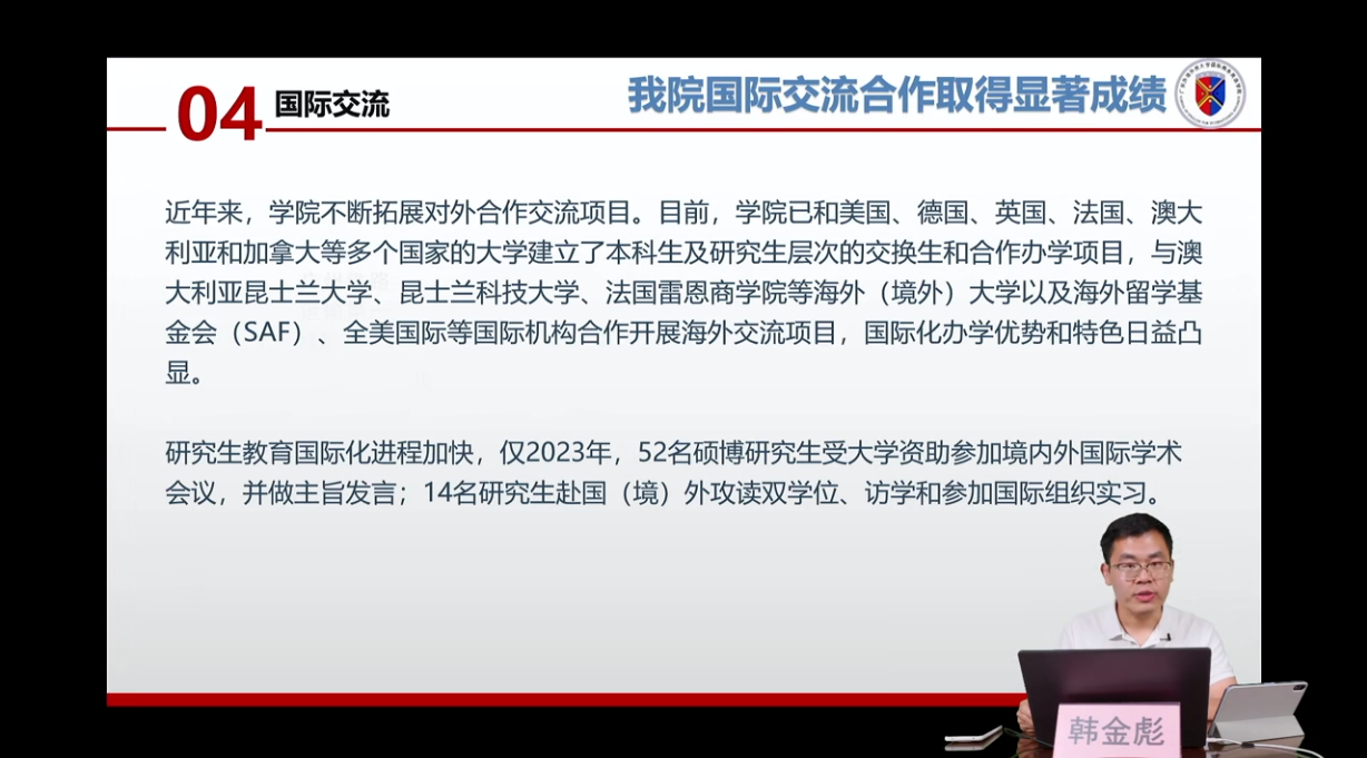 宣讲会由伟德体育陈潇潇副经理主讲,研究生办公室卢楠主任、国际项目中心韩金彪副主任、在读博士生王良莉参与此次直播,从学科历史沿革、学科优势、团队队伍、培养特色、培养成效、毕业生去向等方面,对公司情况进行了全面的介绍。
