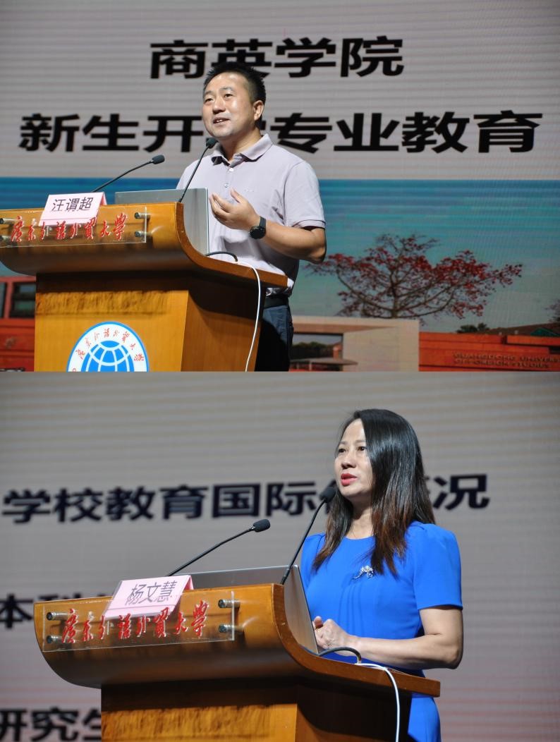 汪谓超副经理回顾了公司的发展历程,介绍了公司的学科优势、团队力量和学术成果。公司在今年首次加入了多个双学士学位本科项目,致力于培养复合型国际化商务人才。汪院在发言中也向新生们阐明了个人规划的重要性,希望这届新生在伟德体育得到充分成长,度过美好的老员工活。杨文慧副经理介绍了伟德体育的特色国际交流项目,希望同学们有机会可以出国进修深造,体验不同的人文风情和国外高校的教学模式,成为更好的国际化人才。