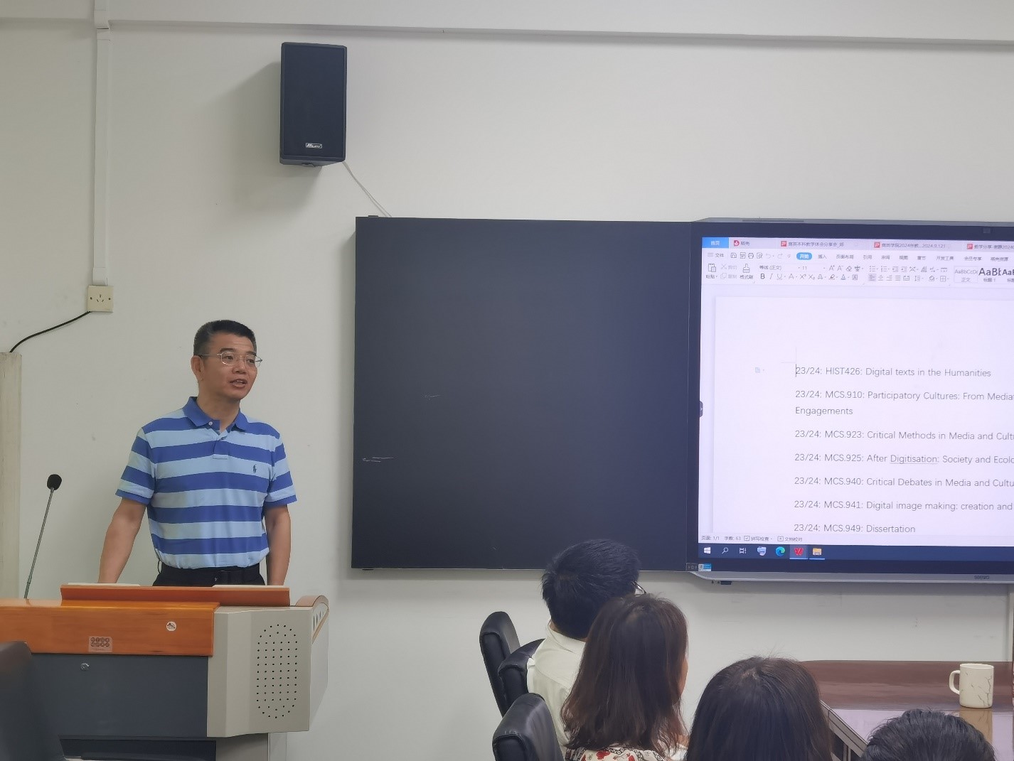 上学期出国进行学习交流的陈光亚、郝佳、乐思伟老师,分享了他们在国外上课和生活的经历。陈光亚老师详细介绍了在英国大学学习的课程内容、教学过程和学习感悟。