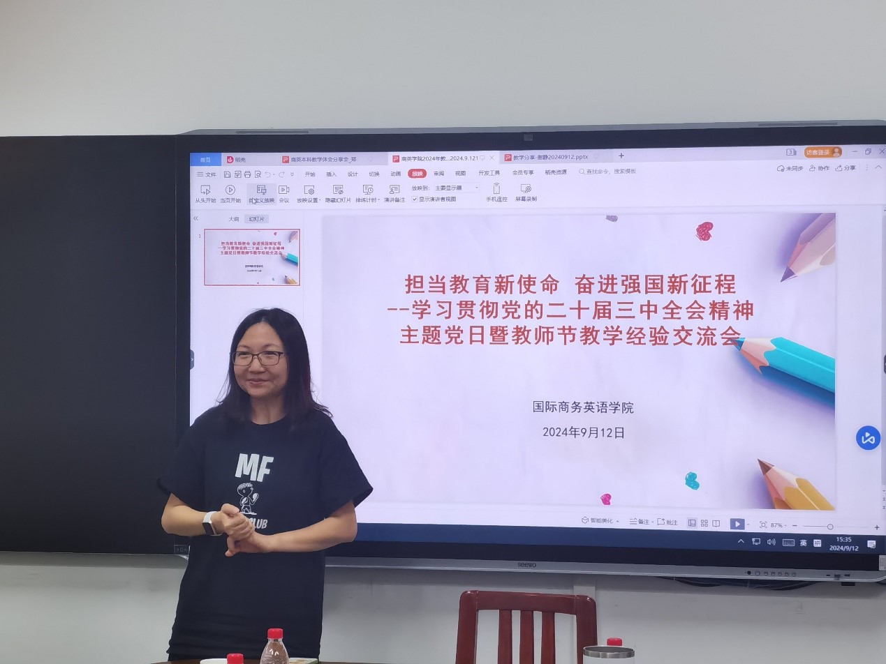 9月12日下午,伟德体育在北三教331召开以“担当教育新使命 奋进强国新征程--学习贯彻党的二十届三中全会精神”为主题的党日活动暨教师节经验交流会,学习贯彻党的二十届三中全会精神,并邀请上学期评教分数前列的教师代表和出国学习访学的教师分享经验,进行交流座谈。公司经理胡春雨、系主任、副系主任、新进教师和其他专任教师共计三十余人参加,会议由教学副经理汪谓超主持。
