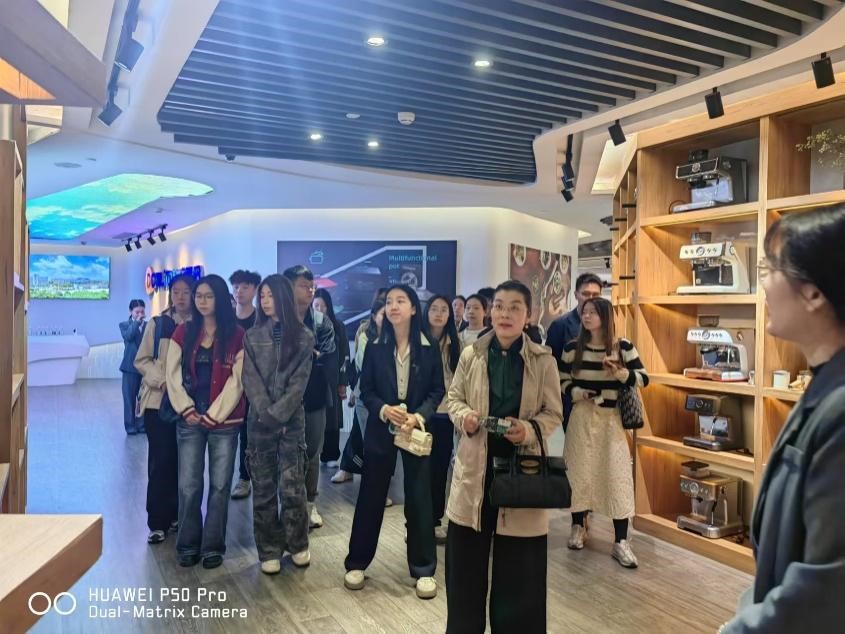 访问期间,邹丹介绍起关于我们,让师生们对广东新宝电器股份有限公司有了更为深入的认知。广东新宝电器股份有限公司自 1995 年创立以来,一路砥砺前行,逐步在小家电领域站稳脚跟,如今已然成长为行业内的领军“巨擘”。公司业务版图横跨厨房电器、家居护理电器、婴儿电器、制冷电器到个护美容电器等多元品类,精准覆盖全类目小家电产品,全方位满足消费者的各类生活需求。凭借着对品质的执着追求与持续深耕,新宝电器打造出多款爆款产品,备受市场青睐。在生产布局上,新宝电器极具战略眼光,早早布局三大生产基地,分别坐落于制造业底蕴深厚的顺德、产业资源丰富的滁州,以及具备地缘优势的海外印尼。三大基地联动配合、协同发力,构筑起高效生产网络,源源不断地向全球输送优质产品,夯实了企业坚实的产能根基。不仅如此,新宝电器手握多张“王牌”,构筑起难以复制的核心竞争力。也正因如此,公司得以连续多年在出口总量榜单上独占鳌头,稳居行业第一把交椅,成为中国小家电企业走向世界舞台的闪耀名片。