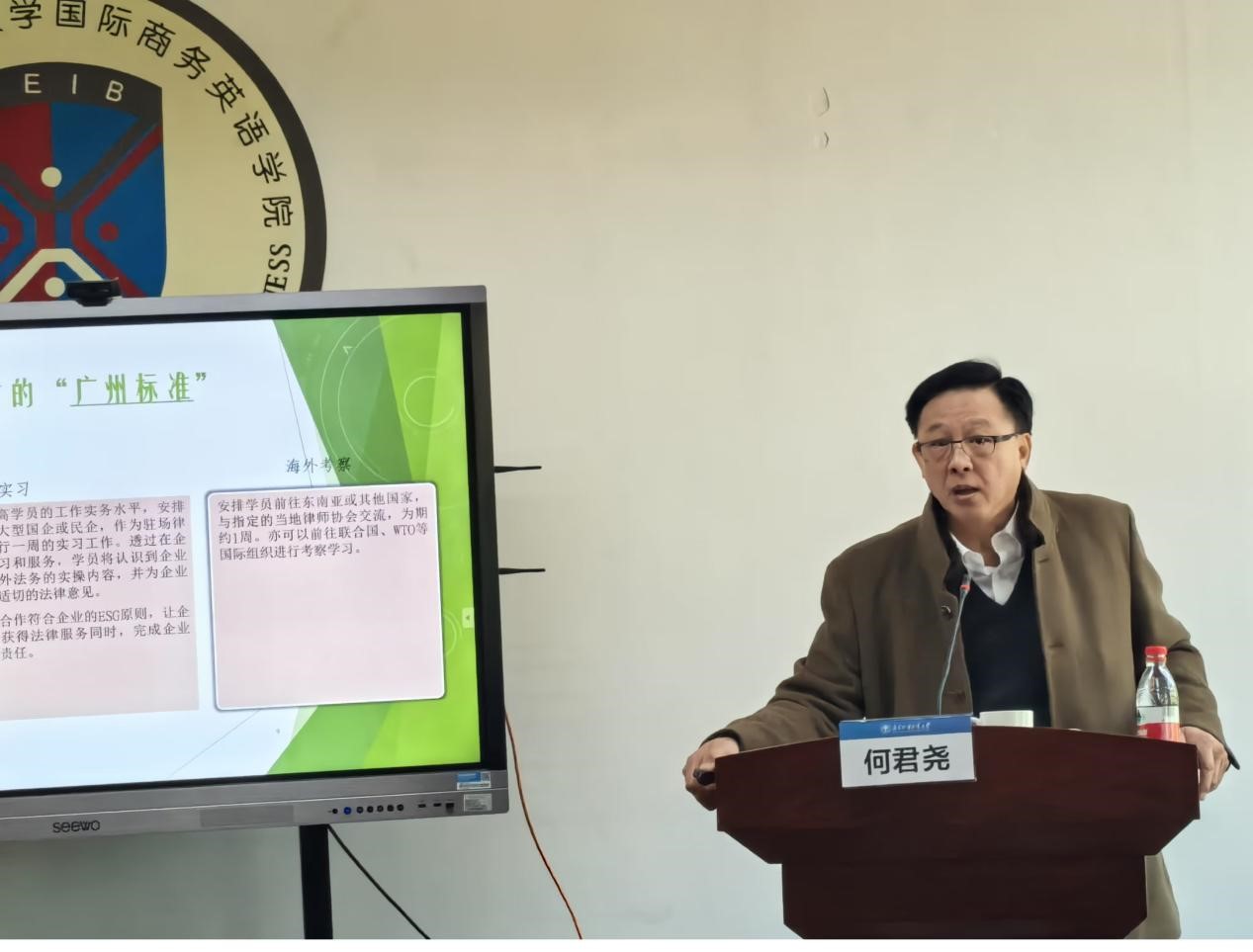 何君尧律师以《涉外法律服务人才的要求》为题开展讲座。他深入解读了党的二十届三中全会法治思想有关内容,强调“法治是中国式全面现代化的保障”,要深化立法领域改革,深入推进依法行政,健全公正执法司法体制机制,完善推进法治社会建设机制,加强涉外法治建设。涉外法律服务人才培养方面,何君尧提出涉外法律服务人才的“广州标准”和“课堂学习-企业实习-海外考察”三位一体的学习模式。