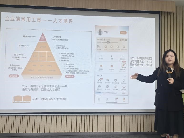 其次,陈镁璇从企业端视角切入,讲解“企业喜欢怎样的求职者”这一问题,并引出一个核心概念——岗位胜任力,即求职者和岗位匹配的基础能力。从这个基础能力延伸出的五大品质分别是:目标感(自我要求)、抗压能力、沟通力、独立思考和责任心。企业常用来测试这几项能力的工具就是MAP性格测评工具。在互动环节,陈镁璇将两位同学的MAP测评报告进行对比分析,为同学们讲解在HR视角下如何分析一位求职者的MAP职业性格报告,讲解要点包括:结果参考性指标、潜质预测(岗位胜任力潜质)、人岗匹配度、职业心理健康测评等。