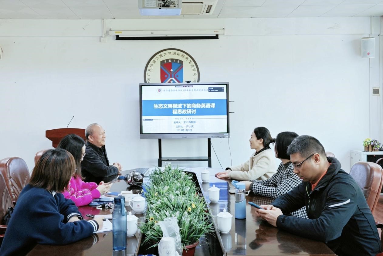 为推进课程思政建设,提升人才培养质量,2025年1月9日下午,伟德体育英语教学部在3教318会议室举行了商务英语课程思政教学实践周教师教研活动。活动邀请我系即将赴任埃及艾因夏姆斯大学孔子公司经理的王小海教授做了题为“生态文明视域下的商务英语课程思政”的讲座。活动由英语教学部主任严小庆主持,英语教学部和国际商务系部分教师参加。