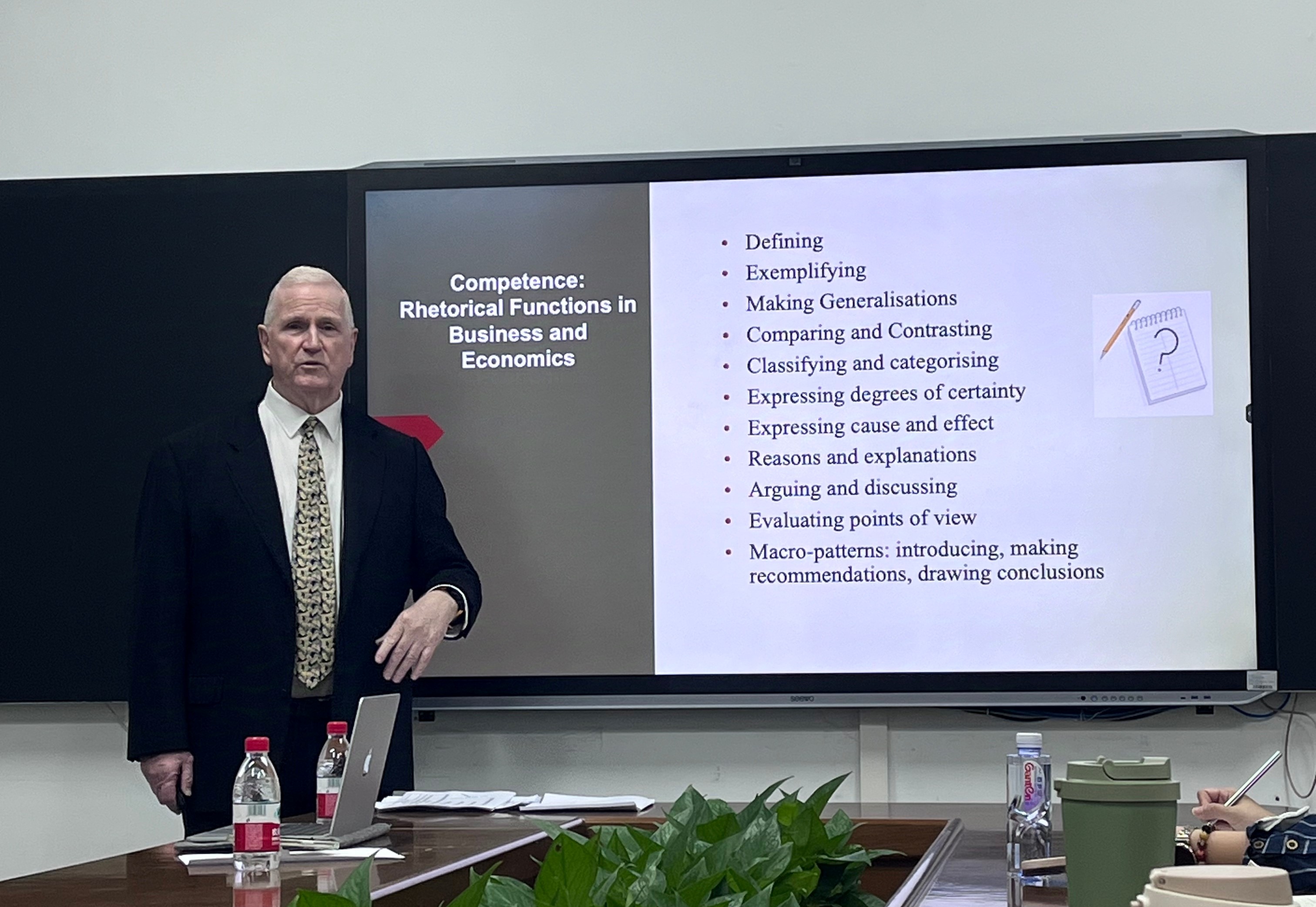 2024年12月5日14:30-16:30,公司云山讲座教授Terrence Royce顺利开展商务英语研究专题系列讲座第一讲,主题为“Research in Economics and Business journals: a functional, rhetorical view”,彭娜老师主持。首先,Terrence Royce教授着重强调了从功能视角审视商务和经济类文献的重要性。随后,从系统功能语言学的独特视角出发,详细阐述了语域中的三大核心变量—语场、语旨、语式,在影响人们词汇选择方面所起的关键作用。最后,老师们和同学们满怀热情地与Terrence Royce教授展开了积极的交流与探讨。