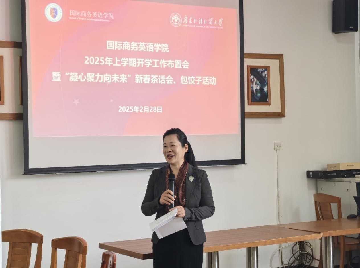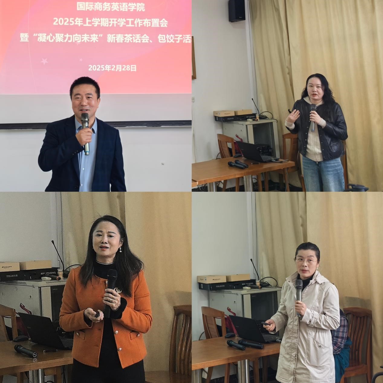 汪谓超副经理、陈潇潇副经理、杨文慧副经理、杜焕君副书记分别就本科教学工作,研究生教学科研工作,国际交流、行政和财务工作以及员工工作等方面作了汇报和布置。法律英语系主任张新红、国际商务系主任康蕾、英语教学部主任严小庆、经贸英语系主任何宇菲、商务英语系主任林洁依次汇报了系部新学期工作设想,提出加强专业内涵建设、提升人才培养质量的相关举措。