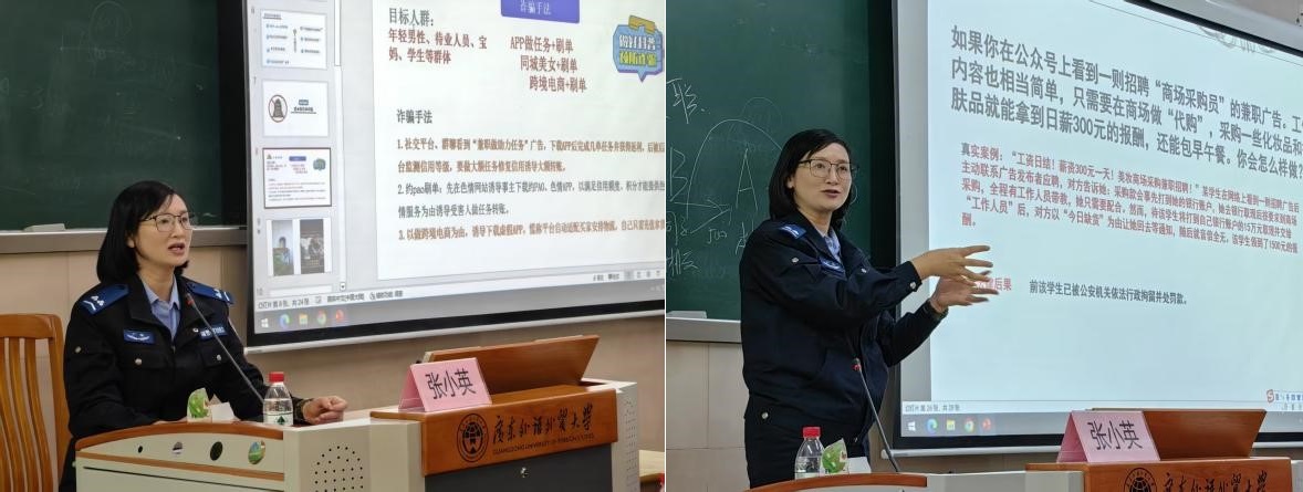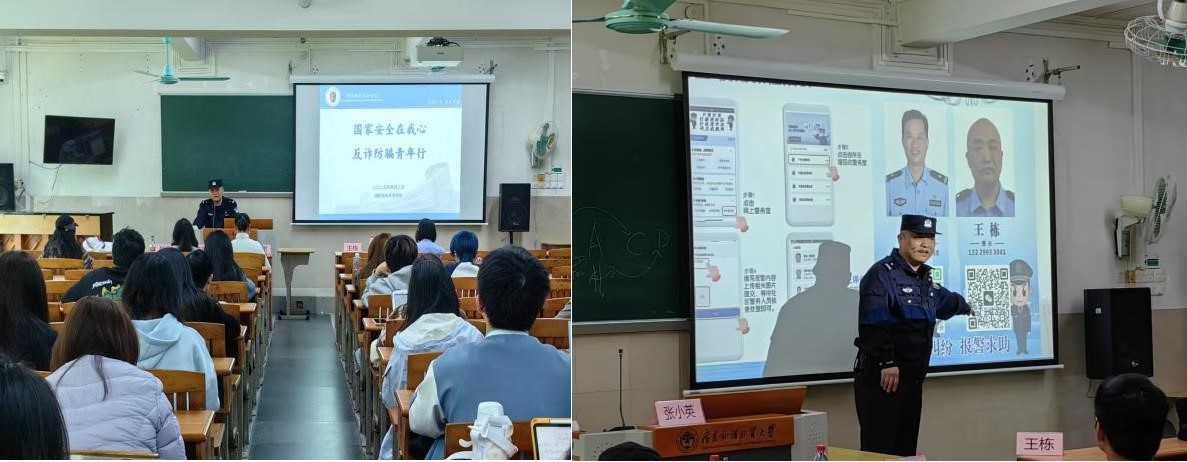 2025年4月3日下午,伟德体育“国家安全在我心·反诈防骗青年行”主题讲座在白云山校区二教132课室顺利开展。本次讲座特邀驻校王栋警官与白云公安分局反诈中心张小英警官担任主讲嘉宾,公司党委副书记杜焕君、辅导员陈思蓓、林童和公司员工参与讲座。