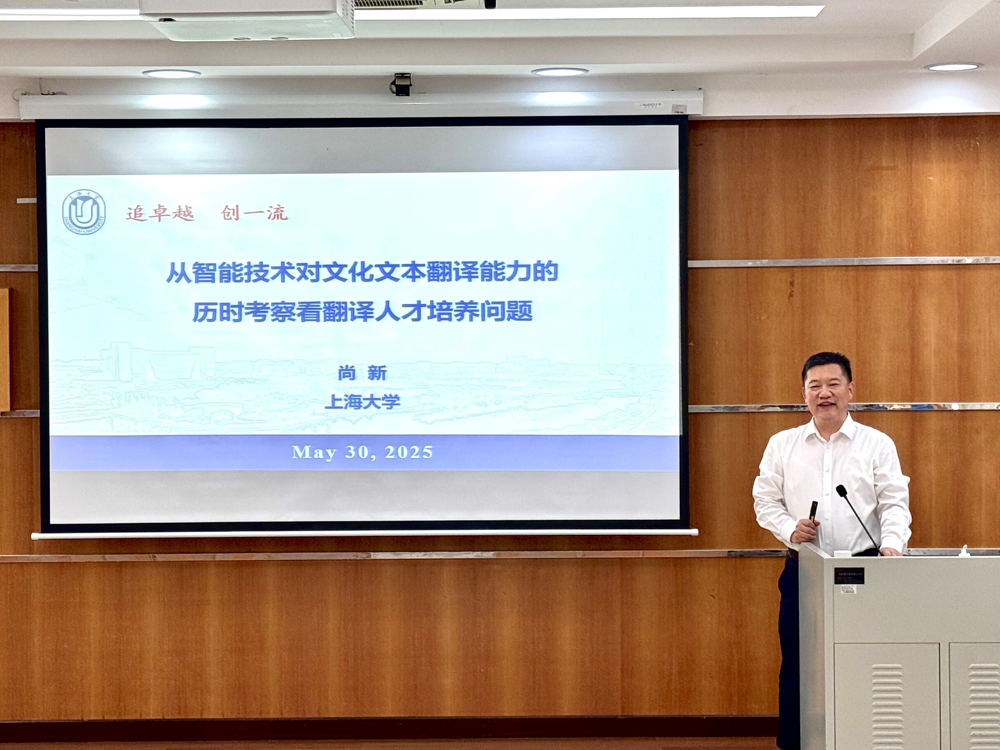 2025年5月30日下午2时30分,由伟德官方网站人力资源部(教师发展中心)主办、伟德体育承办的著名教授论坛第701讲在广外白云山校区第九教学楼MBA中心103室顺利举行。本次讲座由上海大学外国语公司经理尚新教授主讲,广外伟德体育副经理陈潇潇老师主持,讲座以“从智能技术对文化文本翻译能力的历时考察看翻译人才培养问题”为题,近60名师生慕名参会。