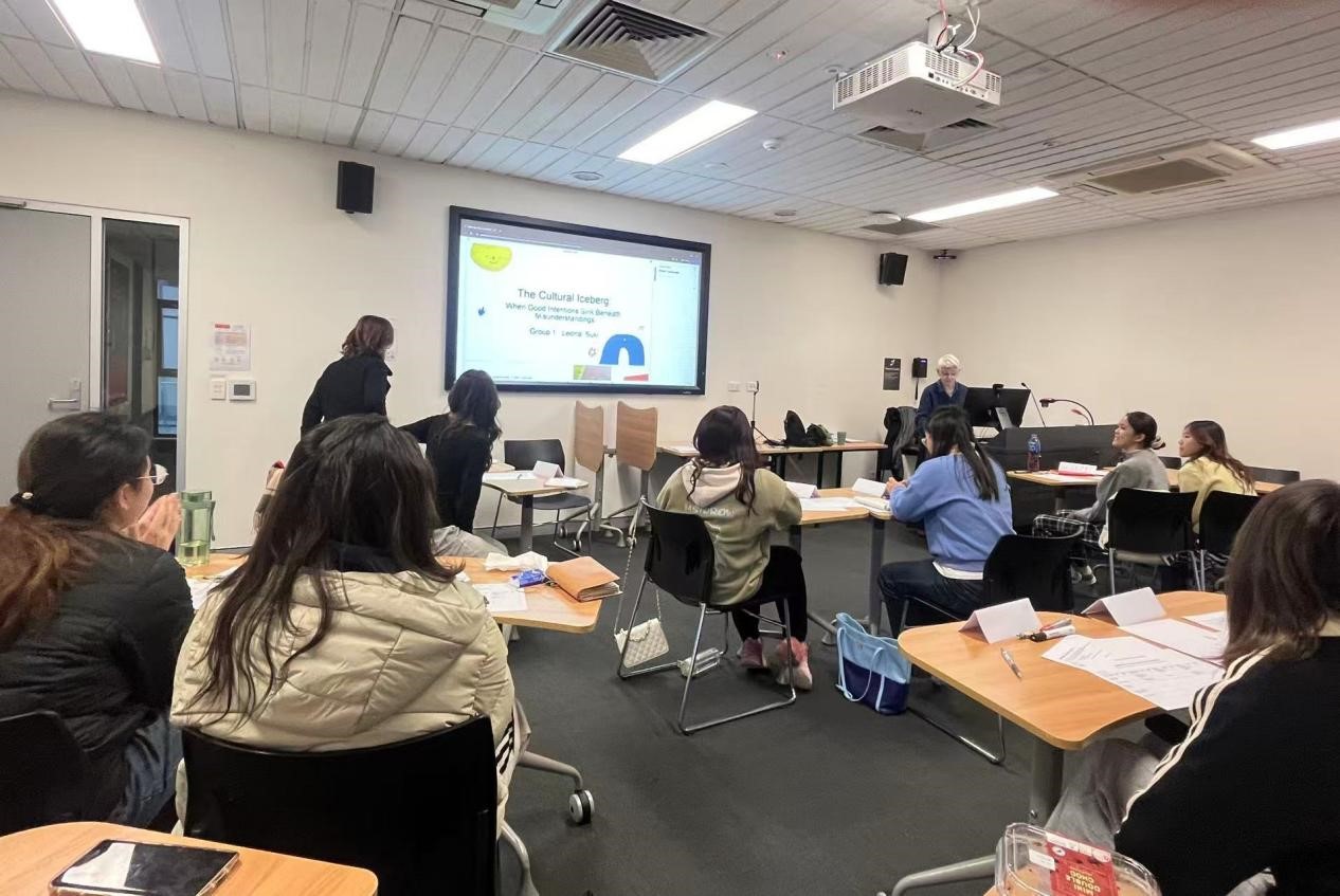 8月8日,同学们分组围绕多元文化团队协作、避免误解等跨文化主题进行演讲,在轻松愉快的氛围中完成首次课程展示。Trish老师认真聆听每一组汇报,并从内容组织、演讲技巧等方面给予详细反馈与建议。同日,公司副经理、项目带队老师杨文慧教授与其他高校同行领队教师拜访了悉尼大学英语教育学习中心(Centre for English Teaching and Learning Hub)阿雅主任及中心主管。双方介绍各自公司的教学和科研情况,并围绕项目可持续发展、《商务沟通》课程建设以及其他国际合作项目拓展进行了深入交流,为后期合作奠定了坚实的基础。