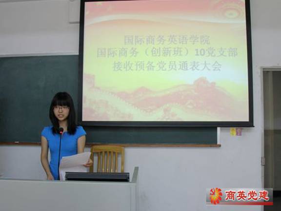 5月24日下午4时,伟德体育国际商务(创新班)10党支部接收预备党员通表大会在二教202顺利举行。商英党委书记车小真莅临大会指导工作,10级辅导员连勇也出席了本次大会。