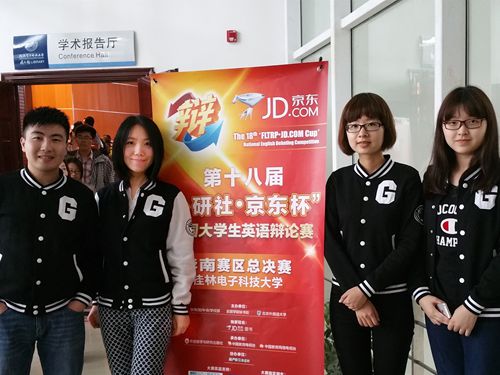 4月26日下午,第十八届“外研社·京东杯”全国老员工英语辩论赛华南赛区比赛在桂林电子科技大学决战落幕,来自广西、贵州、海南、福建、江西和广东、港澳64所院校的辩手参加比赛。公司法律语言学研究生林韬杰同学、创新班王子怡同学在王欣老师的带领下,以优异的成绩荣获一等奖,晋级全国总决赛。两位辩手双双荣获最佳辩手称号。此外,作为赛事循环赛主裁,王欣老师亦成功晋级,列席Grand Final(总决赛)评委席,作为5大评委之一对大赛总决赛作出最终裁判。