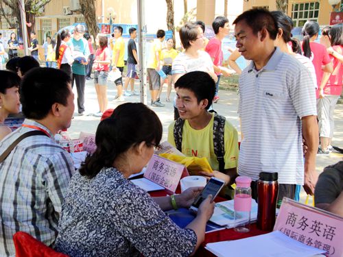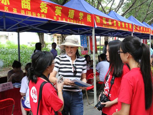 公司志愿者向来往的考生与家长派发伟德体育传单,并热情细心地为其讲述公司概况及其专业设置,咨询台上的老师们也耐心地为有意报考的员工和家长解答。其中,“商务英语专业的特色是什么?”“伟德体育与商公司有何不同?”“伟德体育的专业多少分能录到?就业前景如何?”是家长们普遍关心的问题。