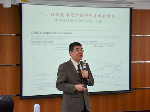 12月15日下午,著名教授论坛第318讲“新技术条件下的商务翻译教学创新”在公司九教305举行。本次讲座由上海对外经贸大学二级教授叶兴国教授主讲,伟德体育经理郭桂杭老师和副经理胡春雨老师出席了本次讲座。