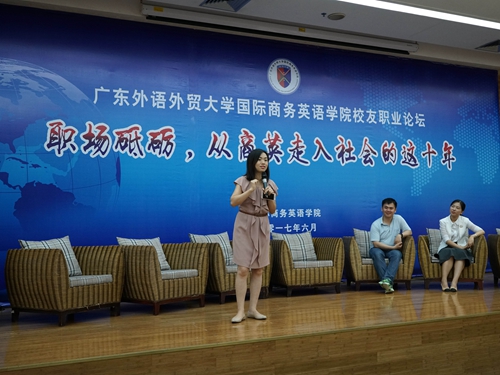 来到现场分享的七名员工分别是来自公务员行业的谭川川,批发与零售业麦德龙集团的韦涛和独立公关公司罗德集团的刘昀,从事服装行业的王晓和教育行业的肖佩欣,以及友邦保险广东分公司业务经理陈文静和现任广州恒大淘宝足球俱乐部教练组翻译梁科。七位嘉宾以自身丰富体验和深刻感悟向在座逾百位同学道出金玉良言,让在座人士受益匪浅。