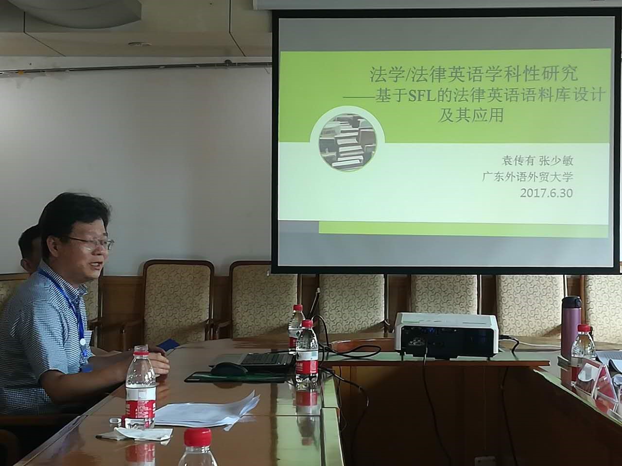 在第一分会场的小组发言中,公司法律语言学带头人袁传有教授和张少敏博士就法学/法律英语学科性研究做了精彩的展示。他们从系统功能语言学的角度阐述了法律英语语料库设计及其应用。在报告中,袁教授首先对法律英语的语言特征进行了描述,并联系学科英语的七大特征,指出基于语料库进行法律英语描述的必要性,进而从法律英语的语料库建设目的出发,阐释了法律英语语料库的定位、架构、建库原则等建库思路,并初步设立了建库的重要数据指标以及语料库的标记和标注规范,旨在为法律英语语料库提供设计依据、建设蓝图和应用愿景规划。
