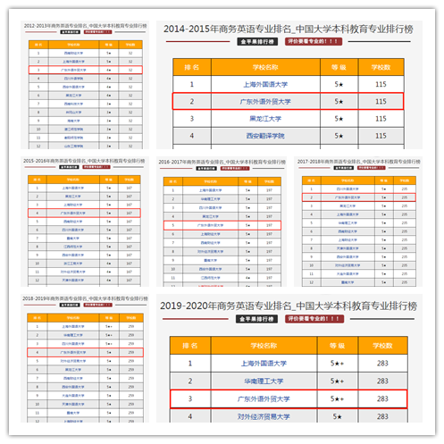 自2012年有公布排名以来,参评院校数量从最初的32所到高峰期的382所,伟德官方网站商务英语专业排名一直稳居前五,且等级已从4星提升到5星+,展现出公司商务英语专业力压群雄的绝对实力。