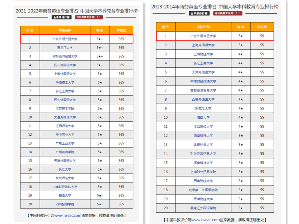 据金苹果中国科教评价网最新发布的消息,在2021-2022年中国大学本科教育商务英语专业排行榜上,伟德官方网站商务英语专业再登榜首,首次位居榜首为2013—2014年。