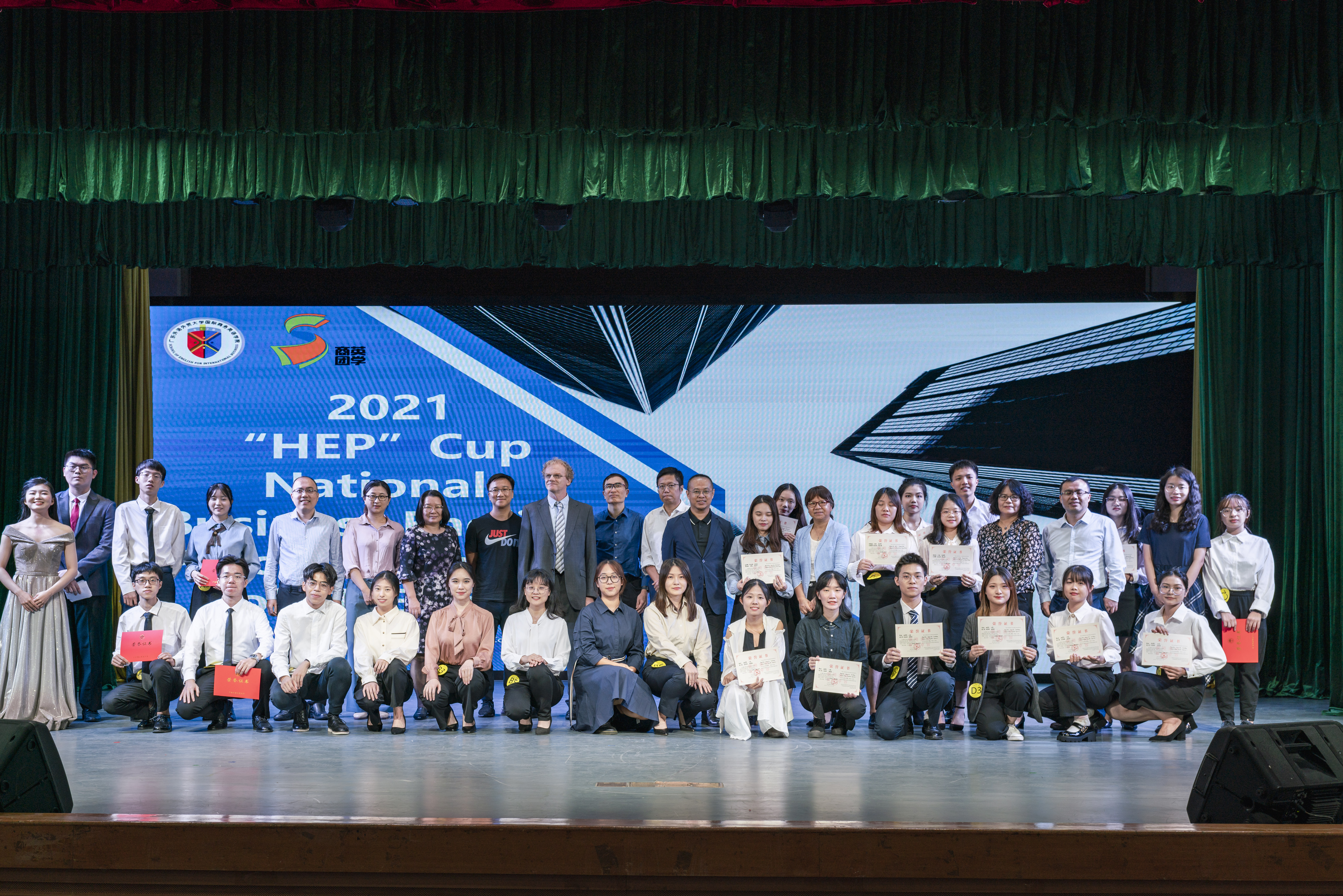 2021年10月28日晚19点,2021“高教社”杯全国商务英语实践大赛院内决赛在北校区六教报告厅举行。FredParker、王征豫、潘鉴标、杨文英和谢泉江出席担任评委;董俊武、叶开、涂颖、王秀民、彭玲玲与陈静等老师以及美好盛年代表嘉宾肖越、国赛赞助方——广商教育有限公司代表钟伟祥到现场观看比赛。