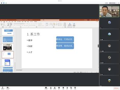 系部主任汪谓超从教学、科研和人才三方面出发,提出英语教学部在教学上应多作创新、多参加竞赛。他鼓励在读博士发表优质论文,并用“路虽远,行则必至;事虽难,做则必成”做总结,指出心态、恒心和热爱的重要性。此外,各位老师也对新引进教师张蓉老师的到来表示热烈欢迎。