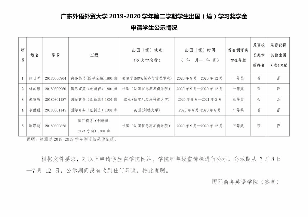 2019-2020学年第二学期员工出国(境)学习奖学金申请员工公示情况
